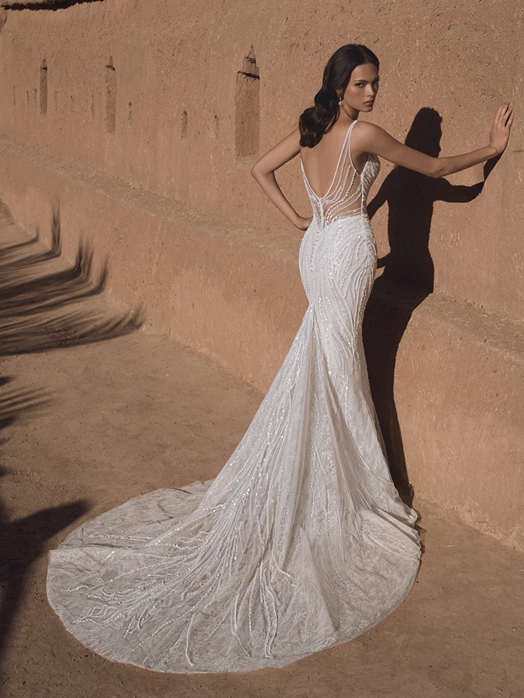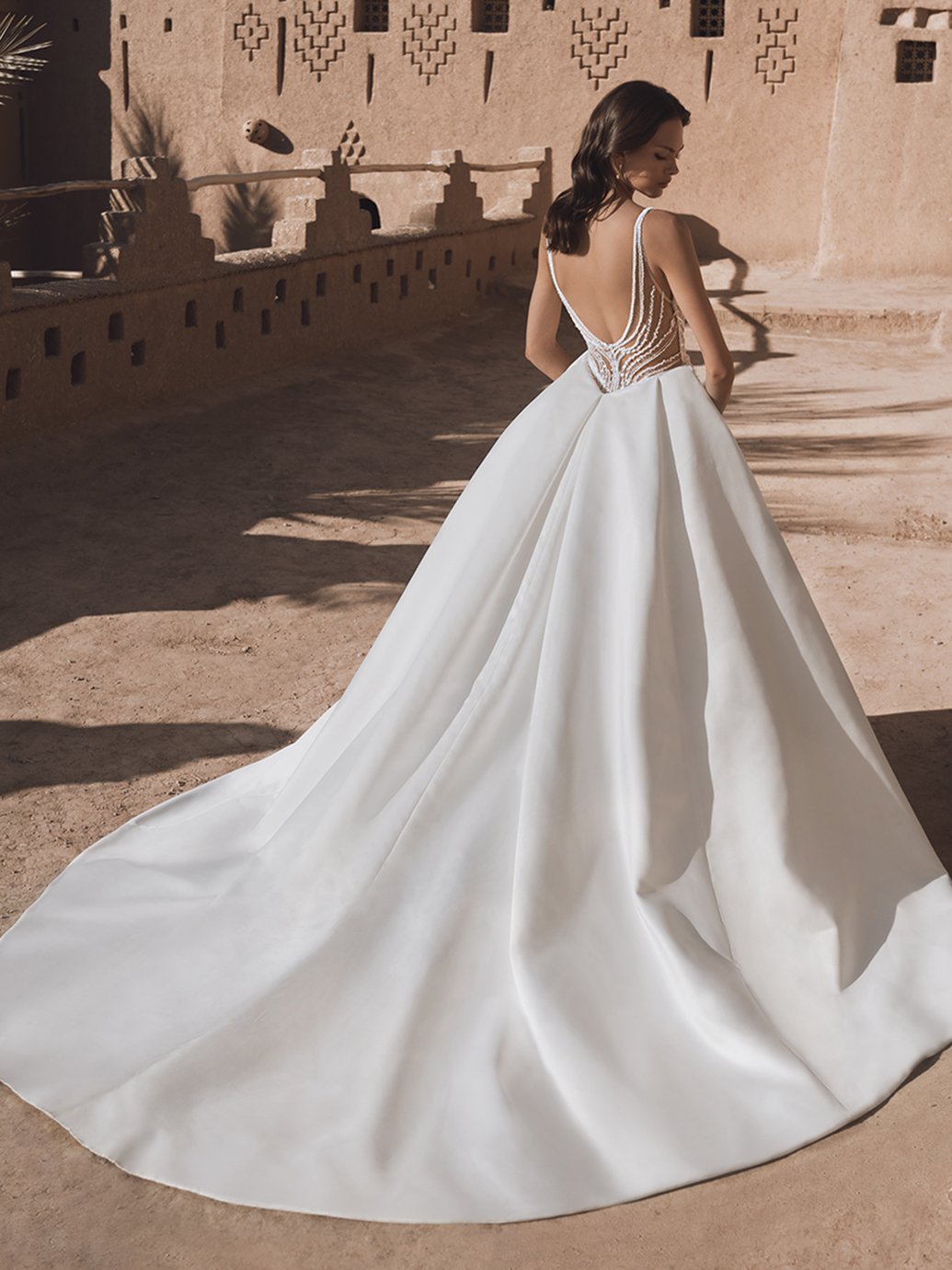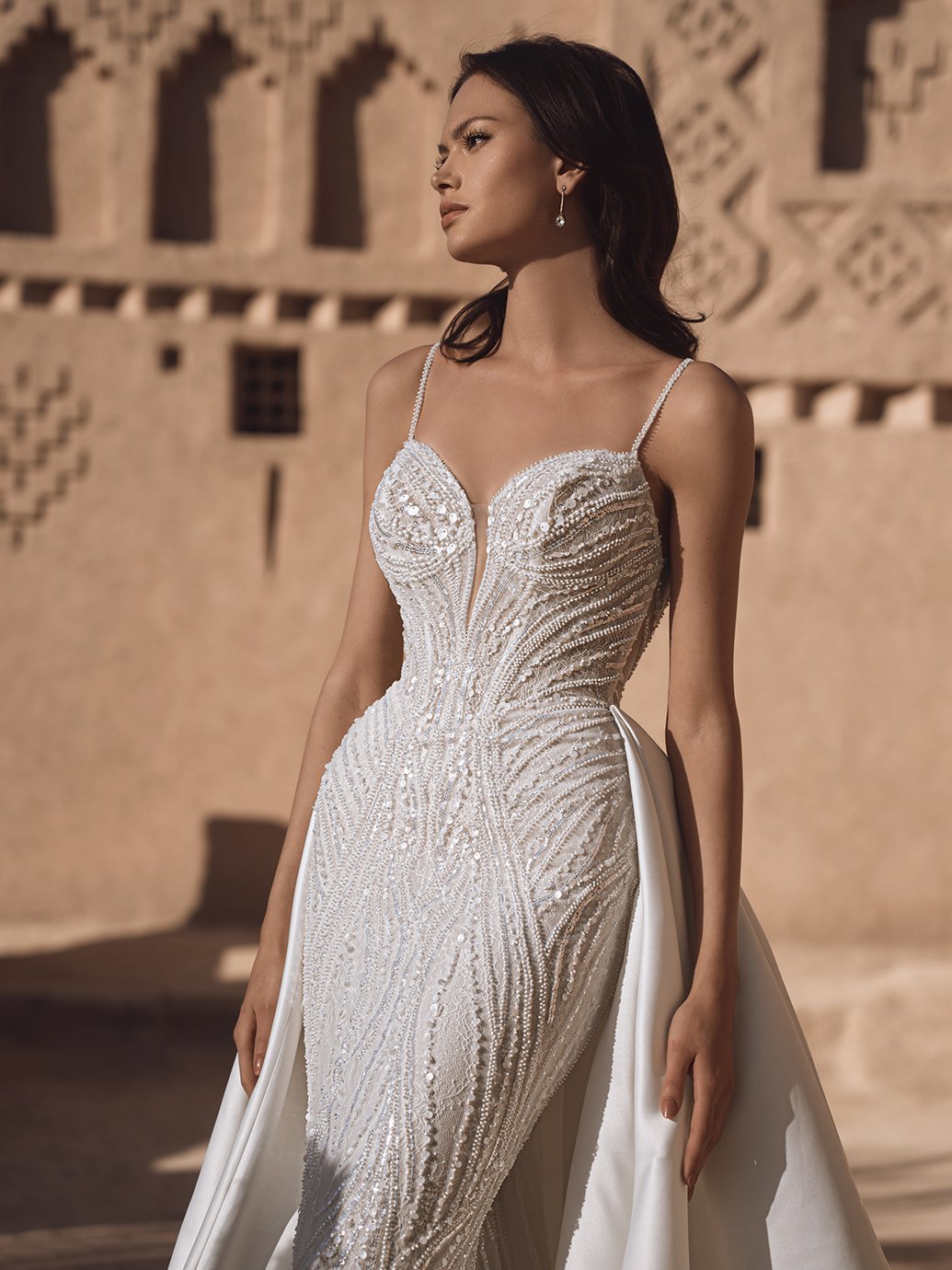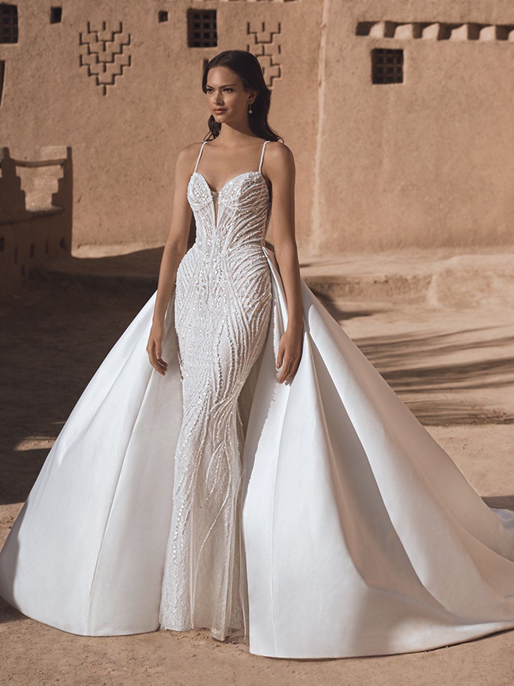 A majestic ballgown silhouette crafted from luxurious beaded geometric lace and mikado fabrics. The sweetheart neckline exudes a touch of Hollywood glam, while the standout 2 in 1 design offers a playful twist to traditional elegance. Shimmering beadwork adds a touch of ethereal allure, cascading down the sculptural train with a mesmerizing effect.
