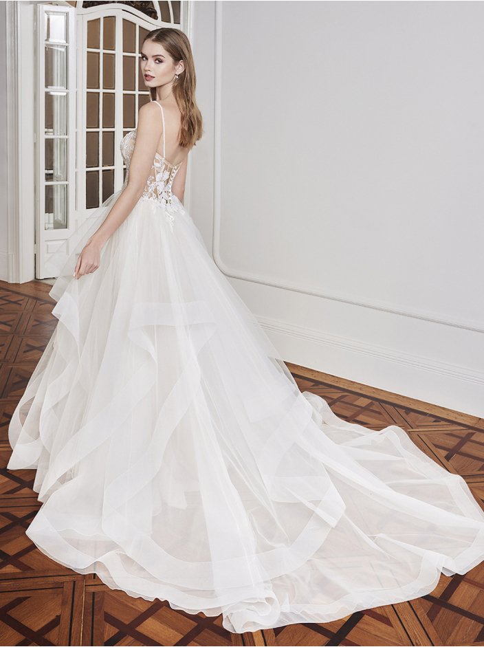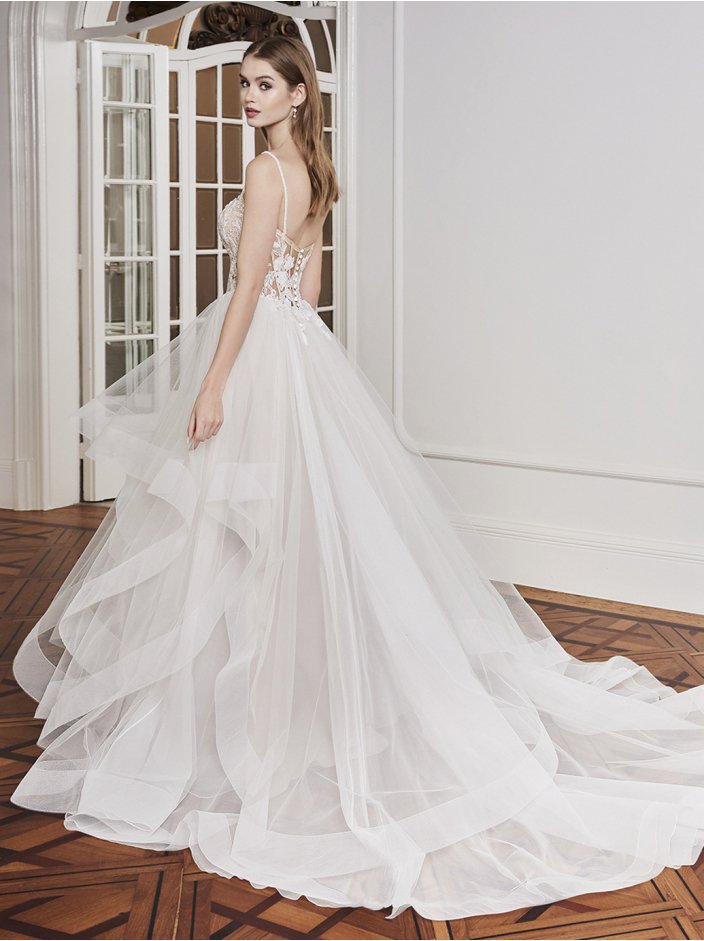 For a fun and flirty look for your wedding day, E2003 presents a gorgeous scoop neckline with intricate beaded straps on the shimmery Chantilly lace ruched tulle bodice and an eye-catching open corset back. The illusion sparkly floral lace side cut-outs accentuate the waist and showcase the flirty ruffled tulle and organza skirt – perfect for dancing the night away on your special day.