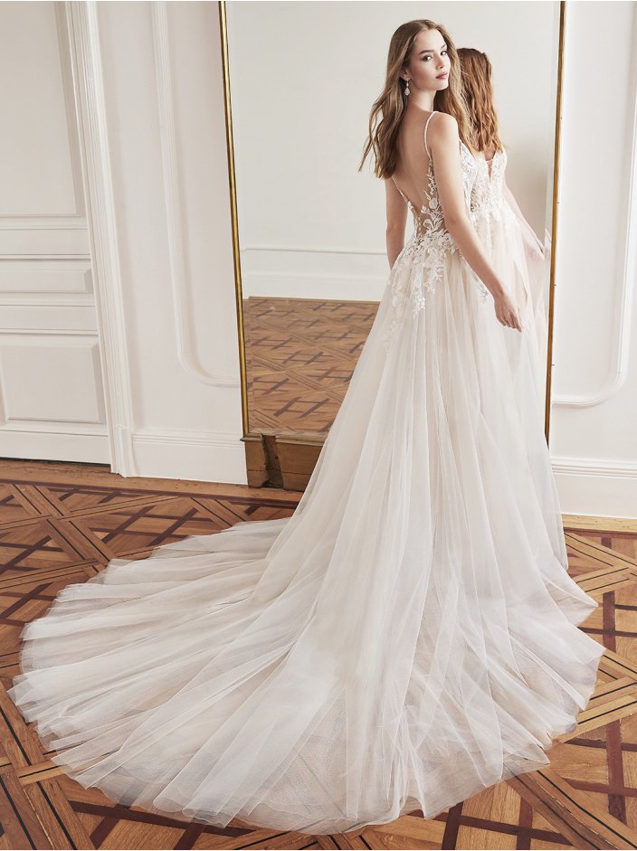 Calling all of our sweet, sophisticated brides! E2016 presents a glimmering V-neckline bodice with delicate beaded straps for a soft glam look. The shimmering floral lace cascades down into the soft tulle skirt with a sexy high slit for the dreamiest bridal look.