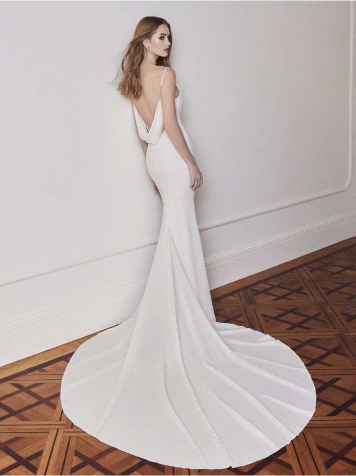 A minimalist and trendy wedding dress for our modern brides! This figure-flattering mermaid gown presents a side-draped bodice and sweet spaghetti straps for a simple yet elegant bridal look. The stunning cowl back draping detail makes this minimalist wedding dress unique and oh-so chic.