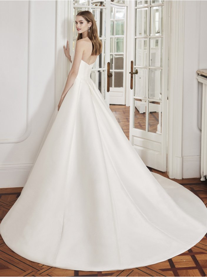 A timeless beauty we can’t help but fall in love with! This Mikado wedding dress presents a divine draped corset bodice with a Basque waistline to make this A-line gown an even more flattering look with its sleek skirt with sexy high slit.