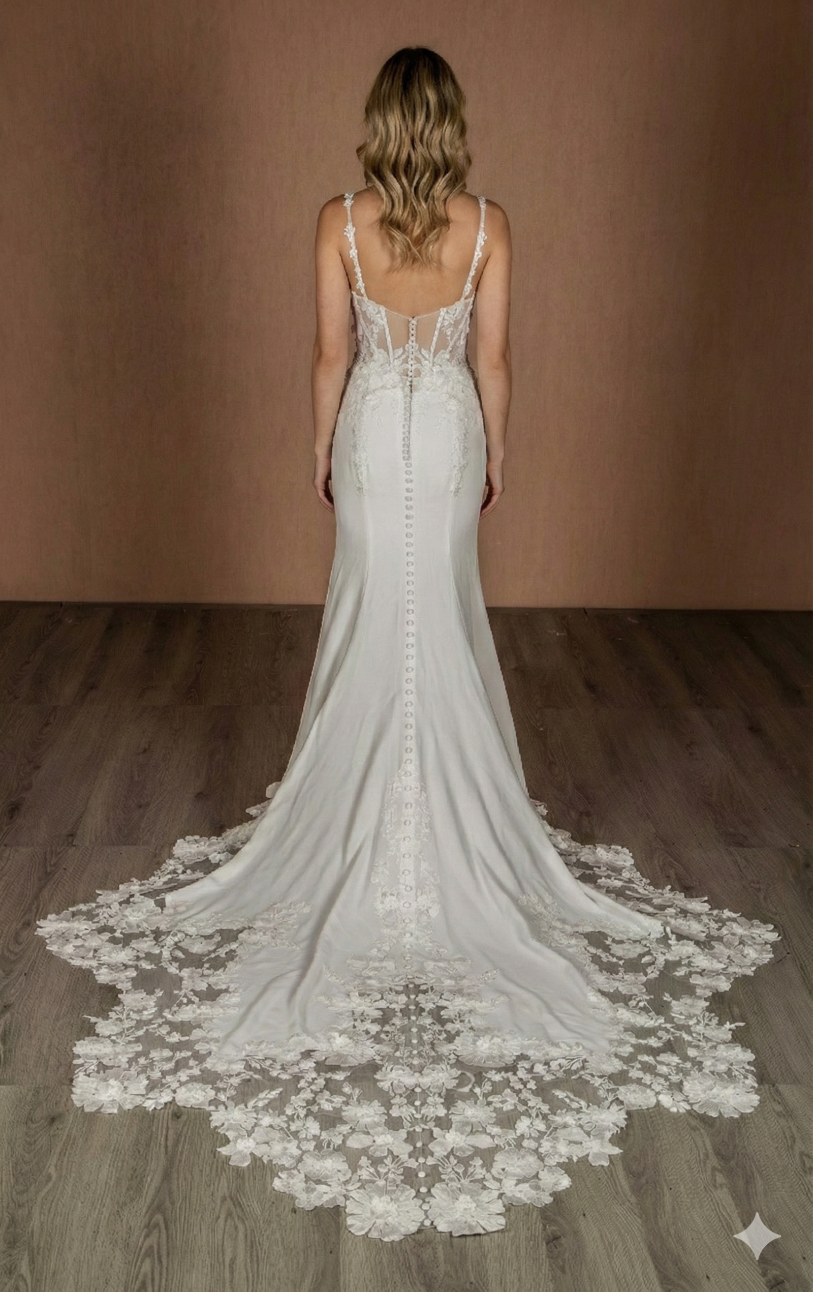 Discover the perfect harmony of modern minimalism and botanical artistry in the Lotus gown. This striking mermaid silhouette features a square-neck corset bodice intricately embroidered with delicate 3d leaf and vine motifs that appear to grow naturally across the skin. The sleek, smooth front of the skirt creates a sophisticated canvas, while ethereal tulle panels adorned with cascading lace bloom from the sides to form a breathtaking, circular train. Designed for the bride who wants a look that is both clean and detailed, the Lotus offers a fresh, romantic aesthetic that our shop can further personalize to suit your style.