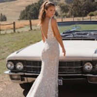 The fit and flare mermaid silhouette gracefully embraces your figure, leading to a dramatic train that creates an unforgettable impression as you walk down the aisle.