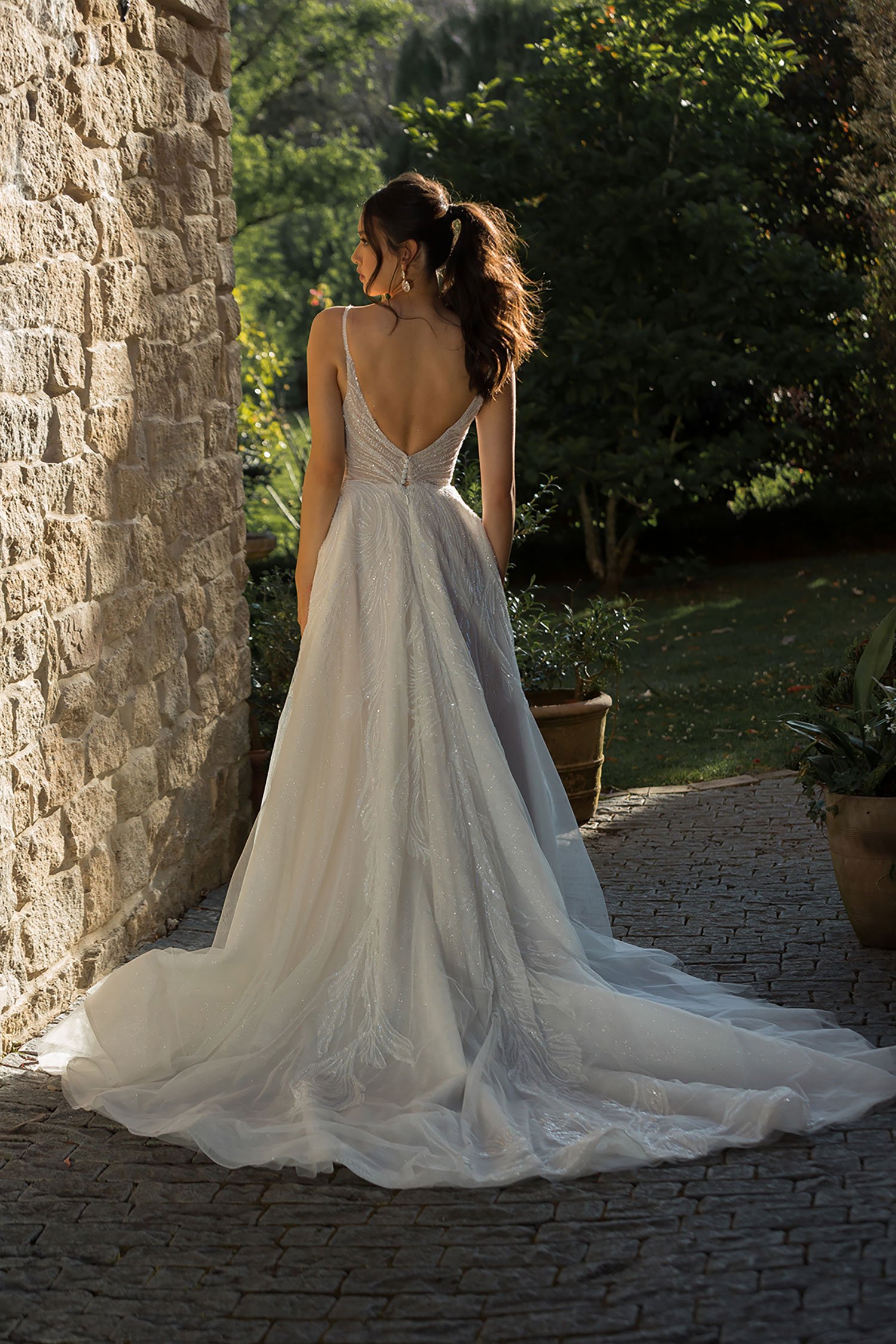 Her sequin and fully beaded silhouette is designed to flatter all body shapes and with her plunge V-neck she is a stunning A-line wedding dress.