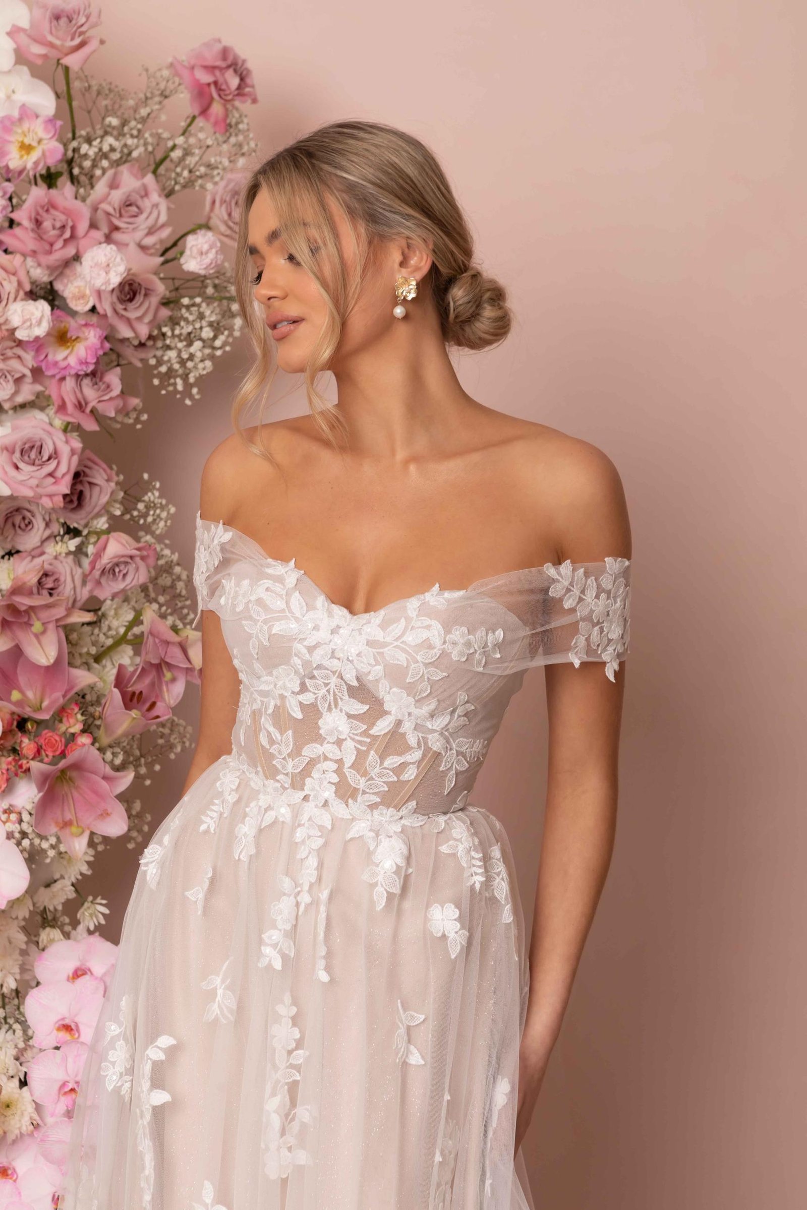 Highlight your decolletage with a soft sweetheart illusion bodice, off-the-shoulder straps and delicately placed lace motifs.