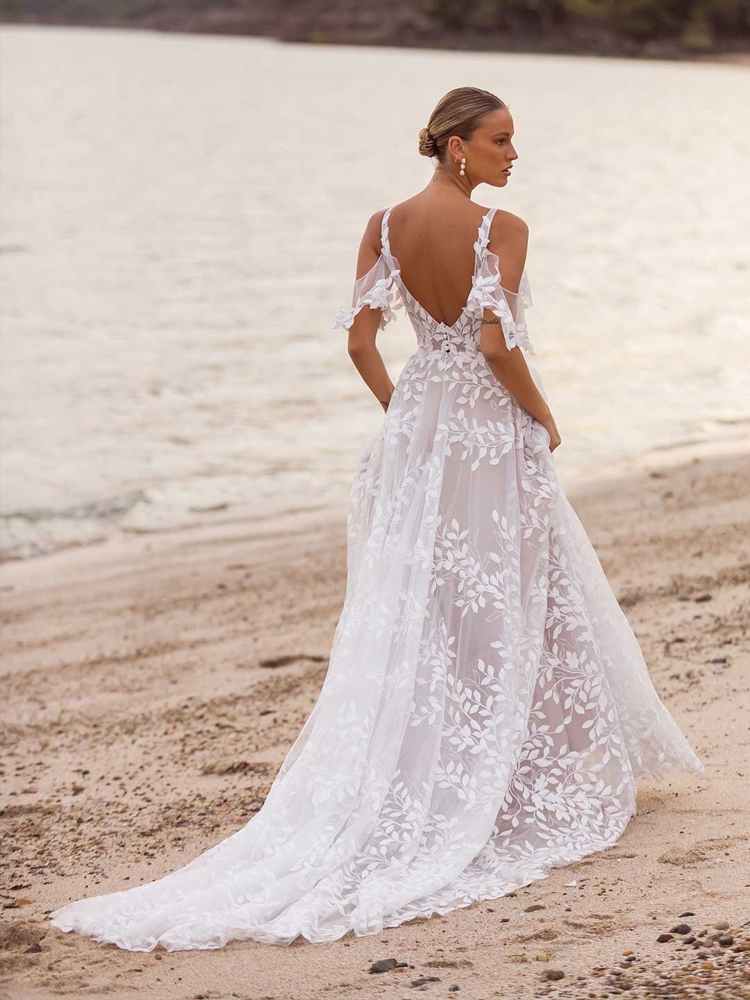 Her signature A-line silhouette and silky Charmeuse lining gives brides a luxurious feel yet remains lightweight for effortless movement.