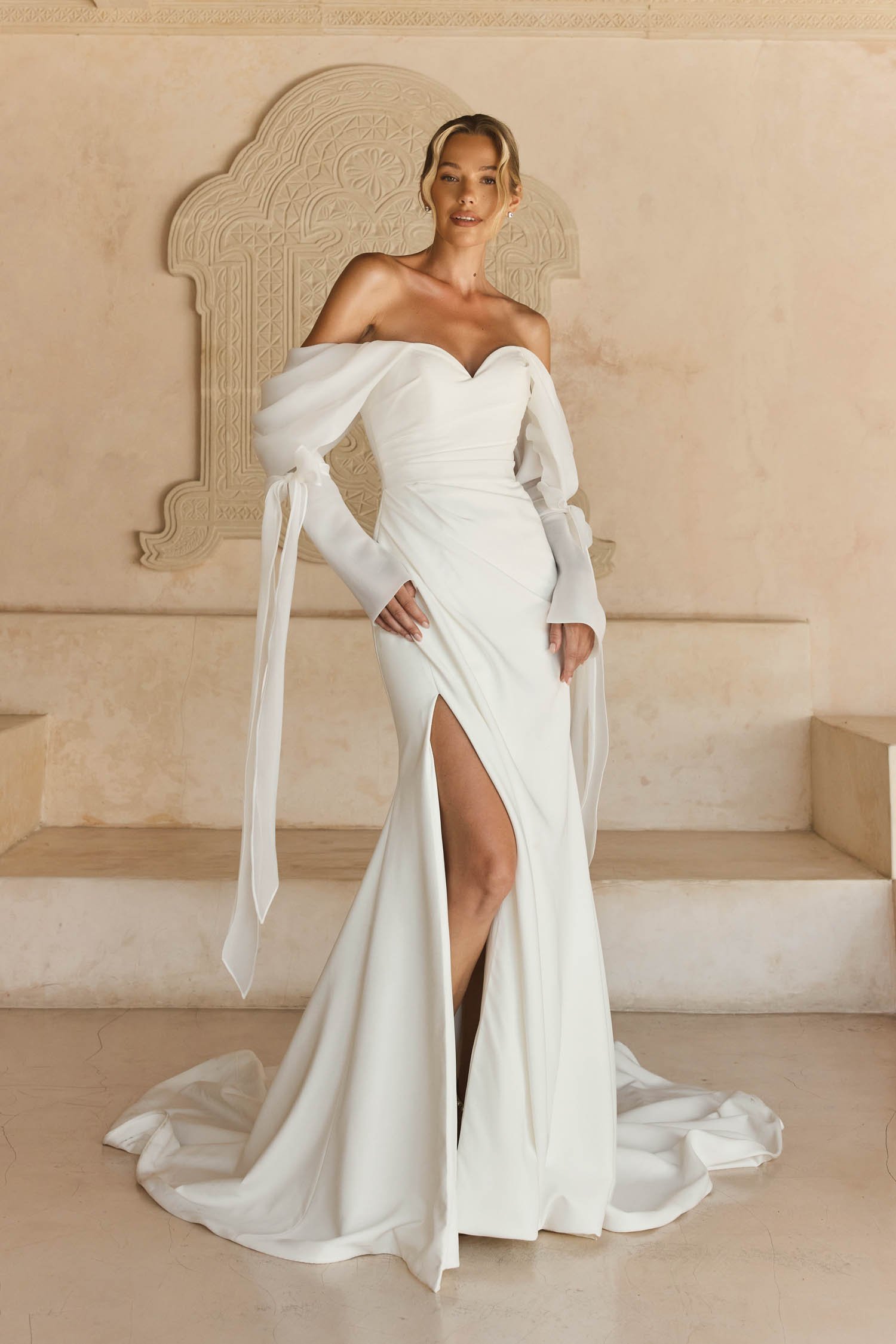 Her on-trend asymmetric pleating through the body and into the skirt, is finished off with a gorgeous leg split and centre back buttons running all the way to her train hem.