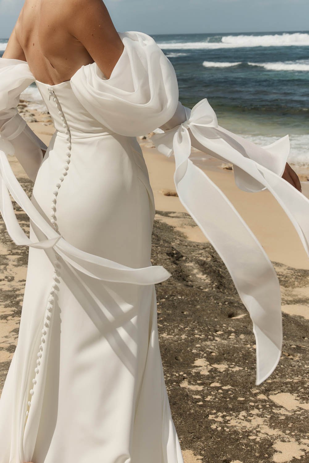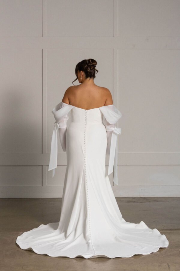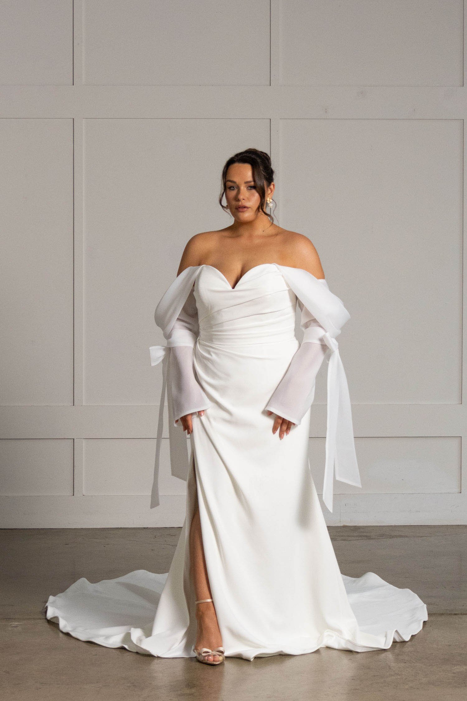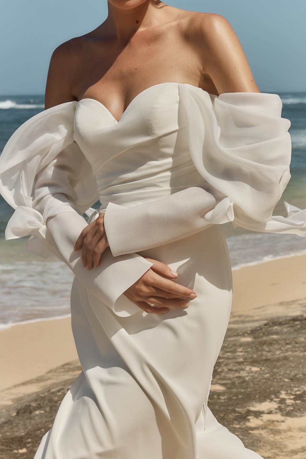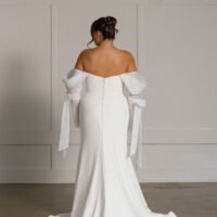 We are obsessed with her off the shoulder pleated statement organza detachable sleeves that add volume, texture and stunning movement.