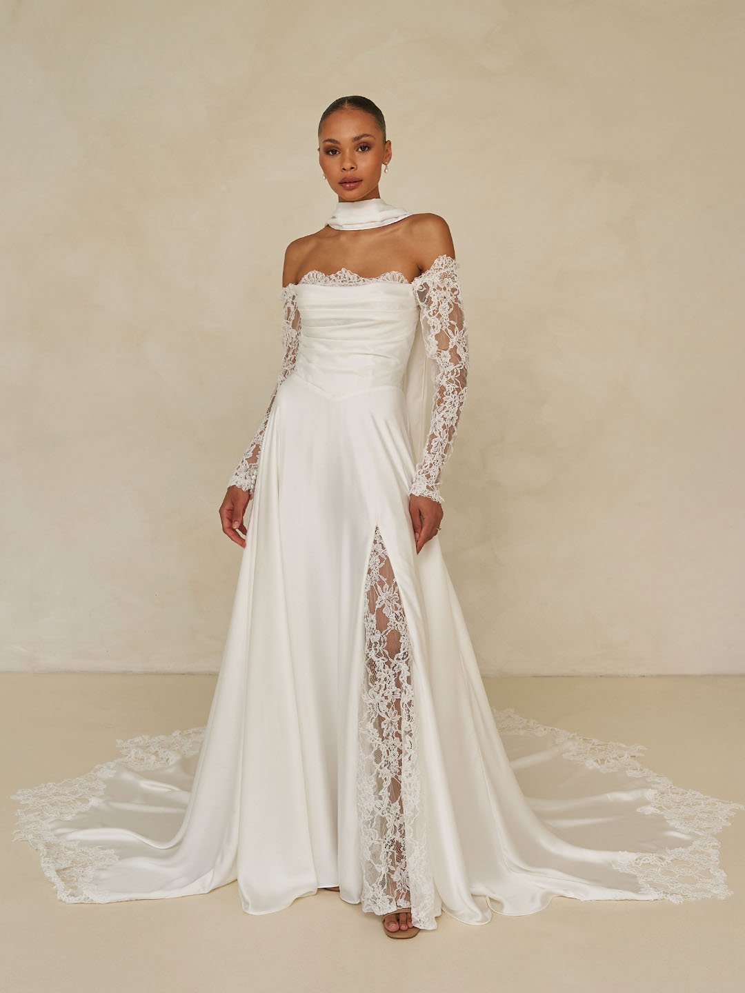 A modern square, off-the-shoulder neckline flows into a softly draped bodice edged with delicate lace trim.