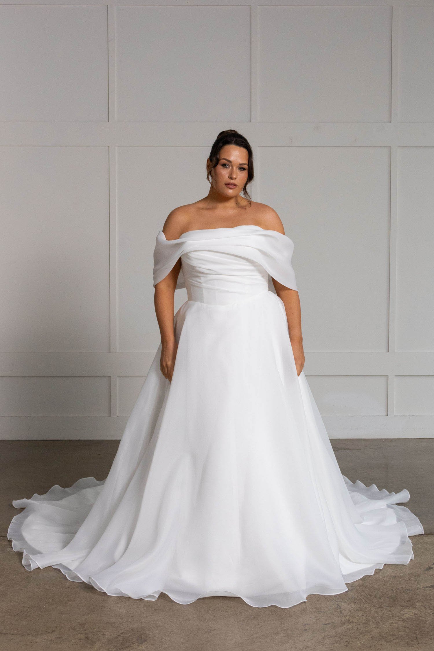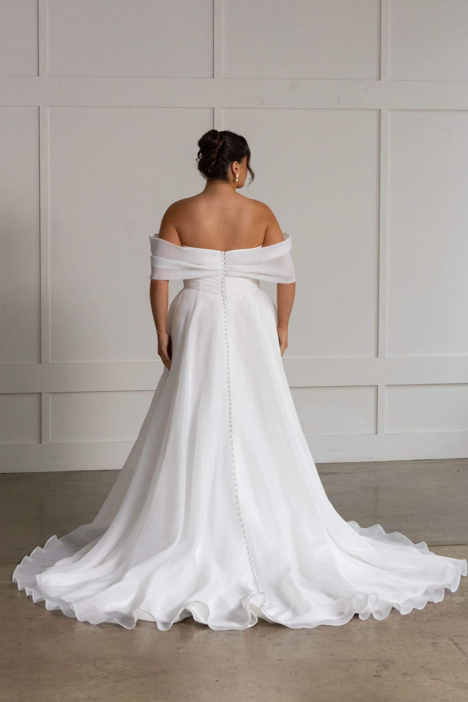 Matching the softness of the fabric is the equally soft off-the-shoulder neckline featuring a draped organza cuff giving the most delicate texture.