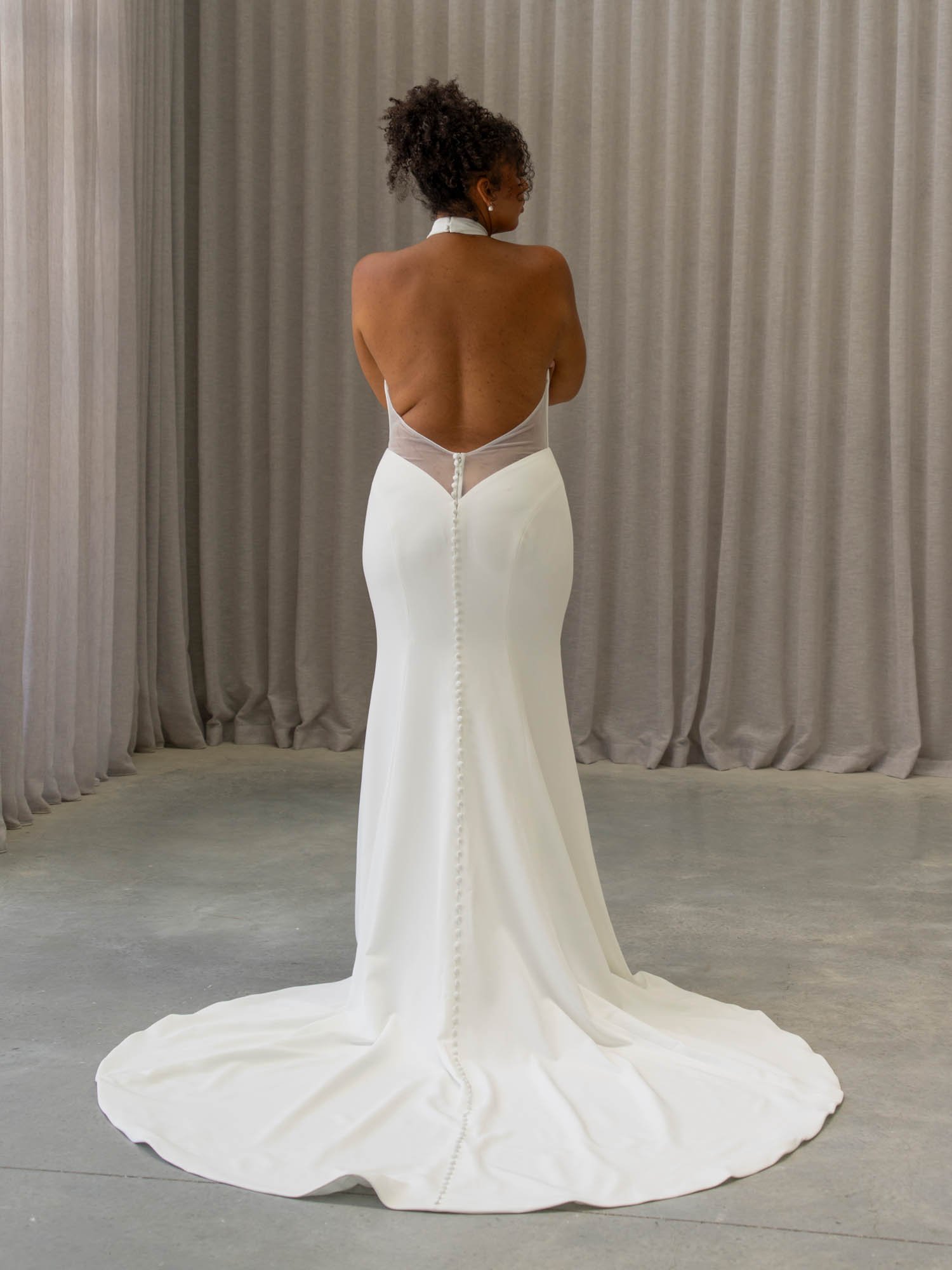 Seam detail follows the contours of the body, along with centre back crepe buttons which run all the way from waist to hemline of her train.