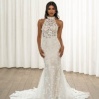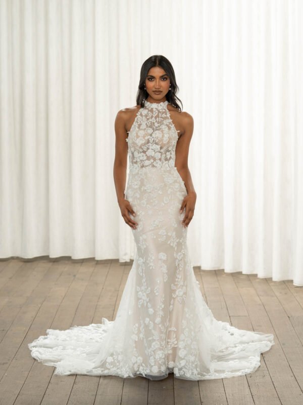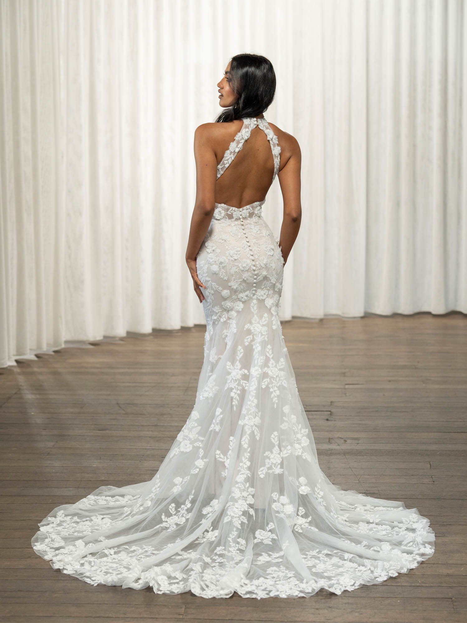The embroidered sequined lace motifs are placed heavily on the bodice for coverage in a linear and shaping fashion down the skirt to accentuate the curves and create an effortless sexy mermaid silhouette.