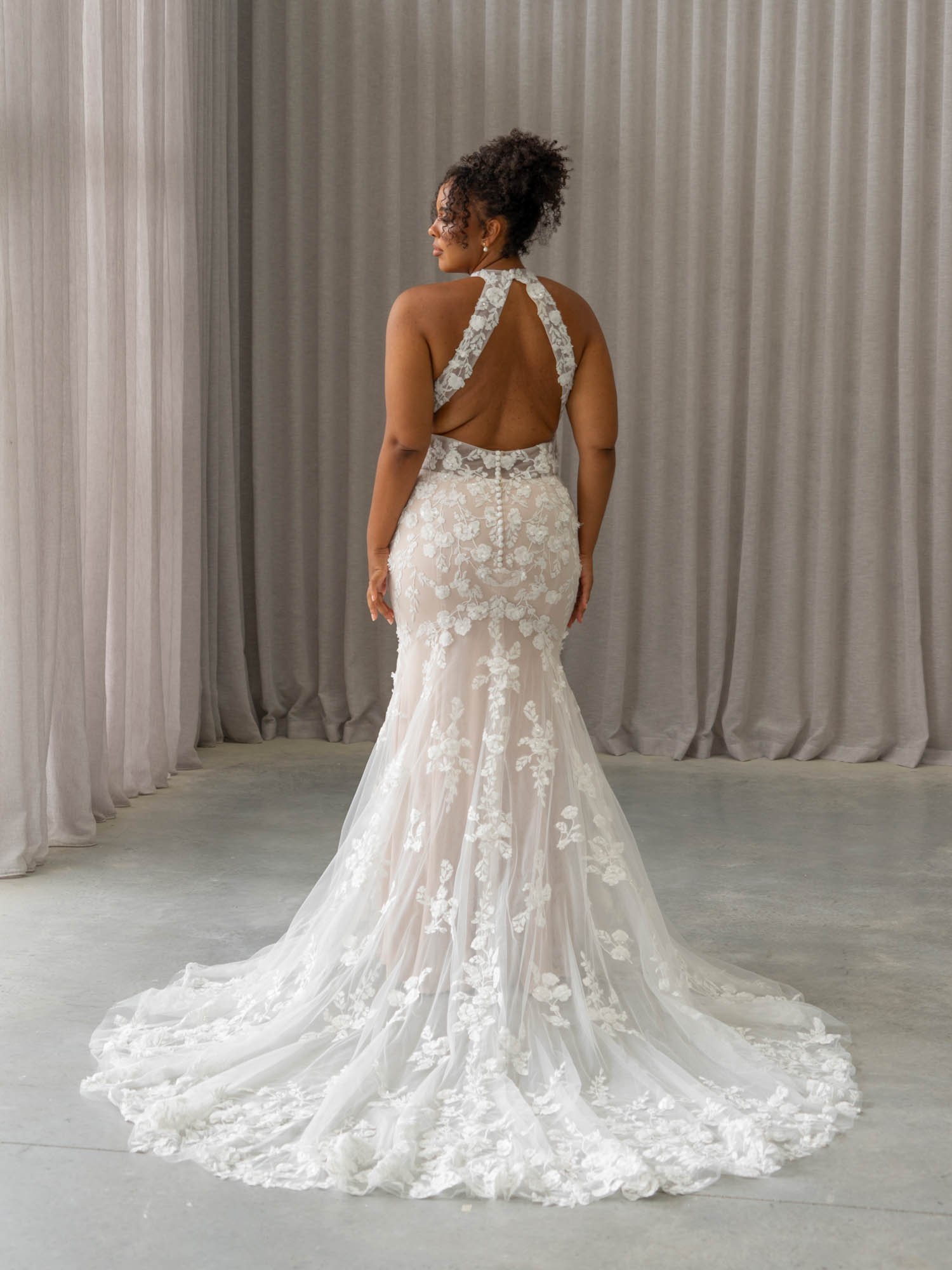 You’ll love her deep open back with illusion lace straps that add contrast to the high neckline.