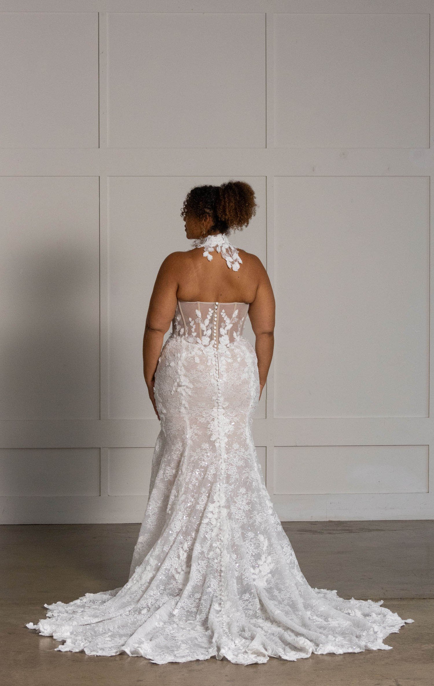 ML1080’s contouring fit and flare skirt is decorated with thoughtful lace placement to create a modern elongating effect through the skirt.