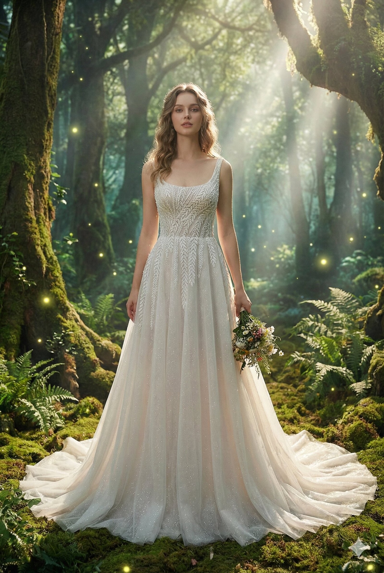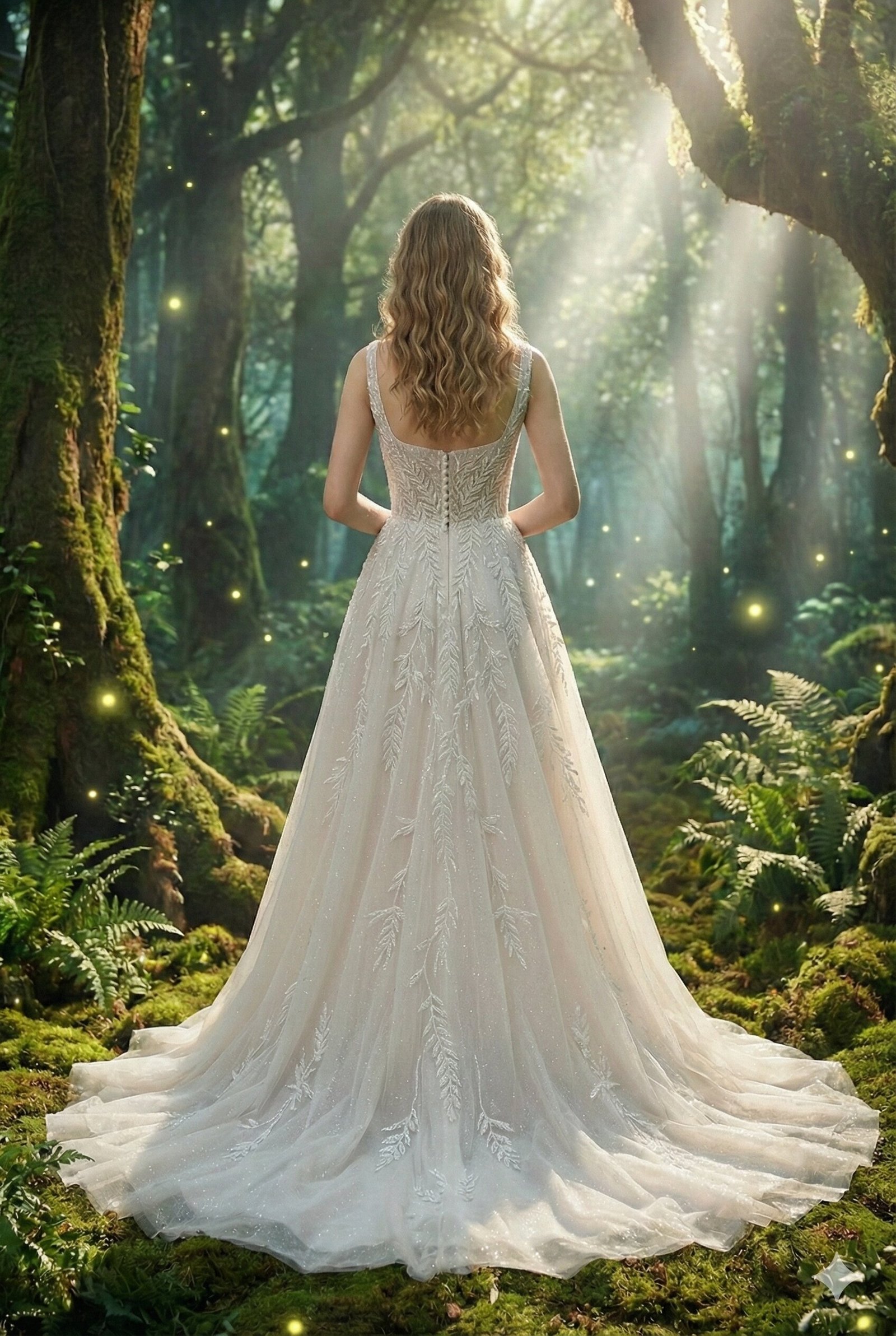 The Moonlit Ivy gown is an enchanted masterpiece designed for the bride who envisions a wedding day filled with ethereal beauty and whimsical charm. This graceful A-line silhouette features a modern scoop neckline and elegant beaded straps that provide a sophisticated and comfortable frame. The bodice is adorned with intricate, botanical-inspired beaded details—reminiscent of delicate ivy—that catches the light beautifully and trails softly down onto a dreamy skirt of shimmering glitter tulle. As the gown flows into a majestic, sparkling train, it creates a soft and luminous glow that is perfect for a magical forest ceremony or a romantic garden celebration.