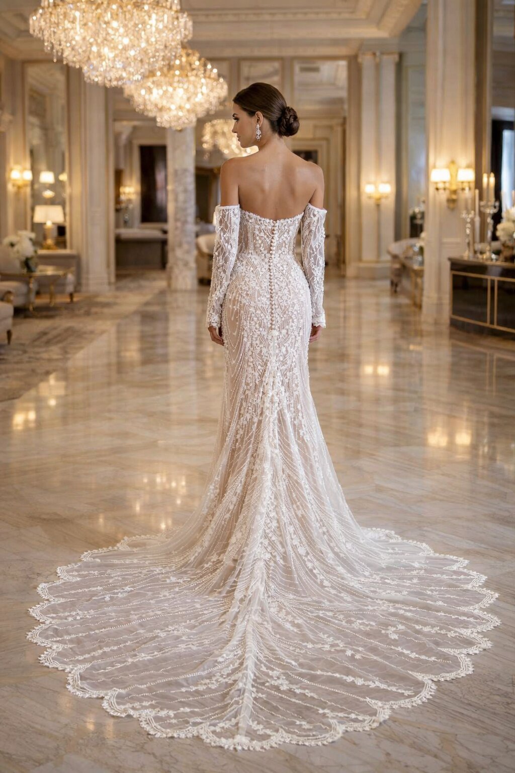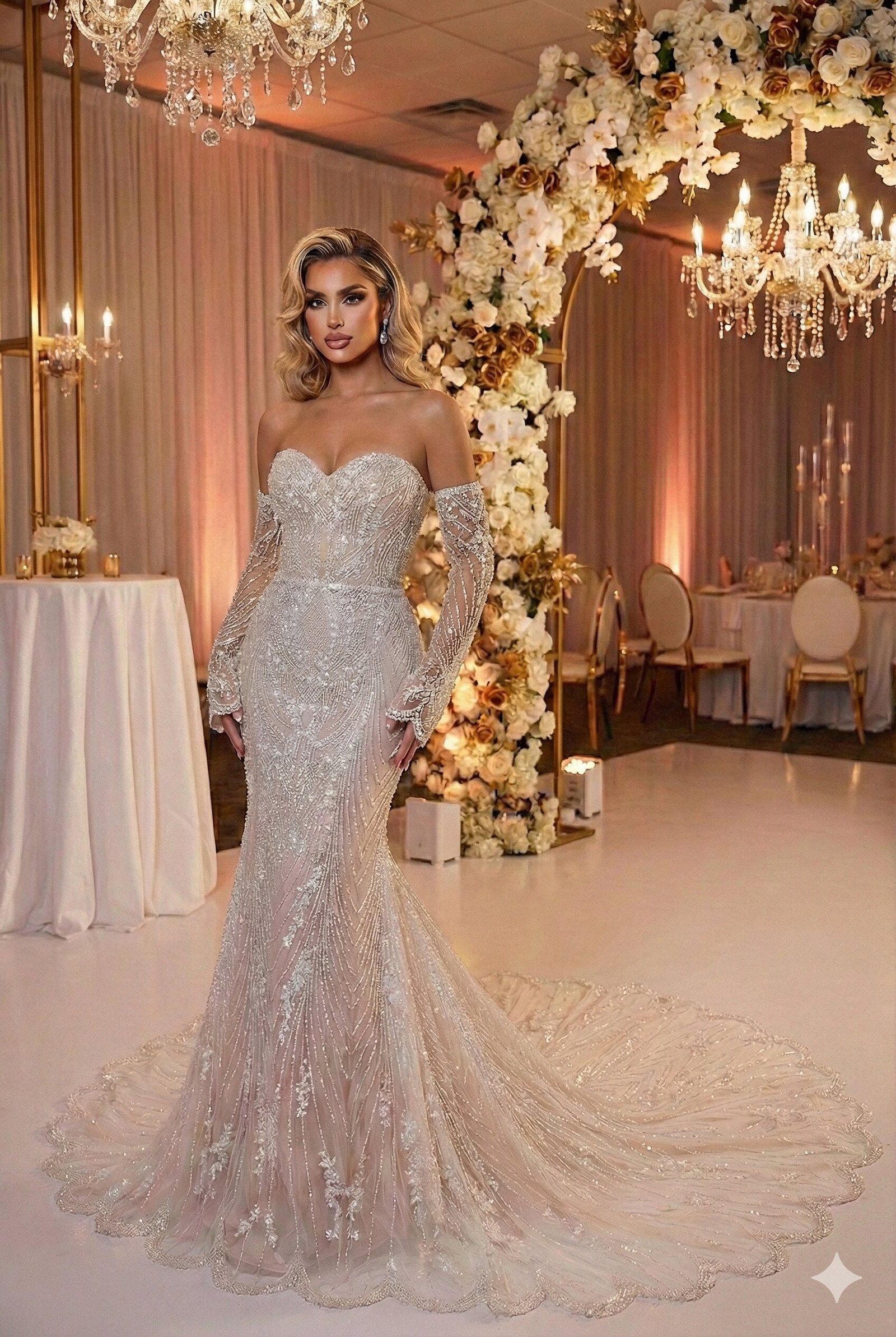 The Pearl gown is a radiant celebration of light and texture, designed for the bride who envisions a wedding day filled with breathtaking glamour and high-fashion allure. This striking mermaid silhouette features a classic strapless sweetheart neckline and a structured bodice that beautifully sculpts your natural curves for a confident, regal look. The entire gown is encrusted with allover shimmering hand-beading and pearls creating a mesmerizing interplay of light that ensures you radiate brilliance from every angle. It flares gracefully into a majestic, circular train with a delicate scalloped edge, providing a grand and romantic finish to your walk down the aisle. Comes with elegant matching beaded sleeves for versatile looks. Perfect for a grand ballroom or a sophisticated evening celebration, the Pearl can be flawlessly tailored to your unique vision through our shop’s specialized bridal alteration and customization services.