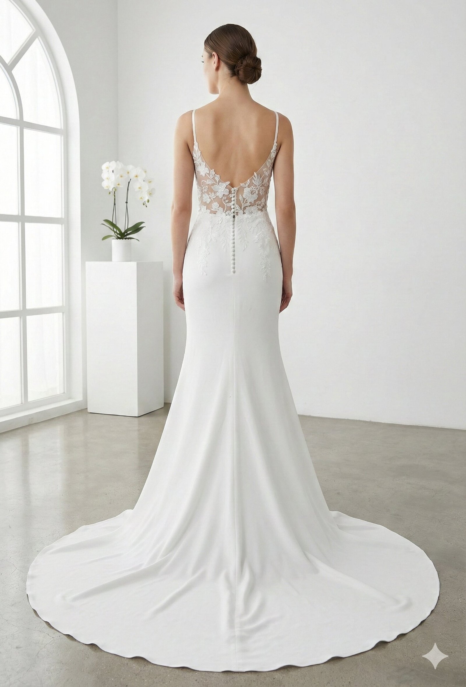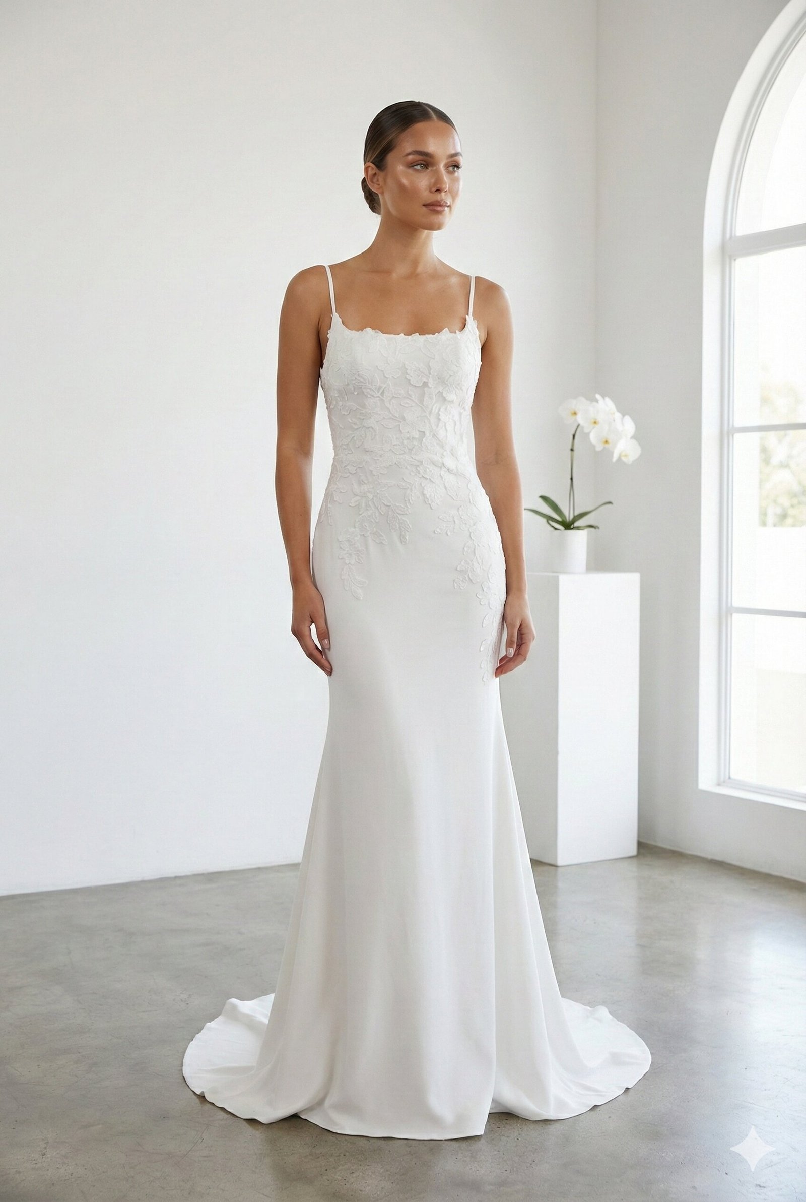 The Petal gown is a stunning balance of minimalist sophistication and delicate romantic detail, perfect for the bride who wants a clean, modern silhouette with a touch of botanical charm. This fit and flare-style gown features a flattering square neckline and dainty spaghetti straps that lead into a sleek bodice adorned with intricate floral lace appliqués. These delicate motifs bloom across the bodice and cascade gracefully down the hips, transitioning into a smooth, elegant skirt that beautifully contours your figure. Finishing with a soft, flowing train, the Petal offers a fresh and timeless aesthetic for your wedding day